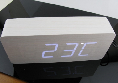 • jam berbentuk kayu yang dapat menampilkan waktu, tanggal dan suhu