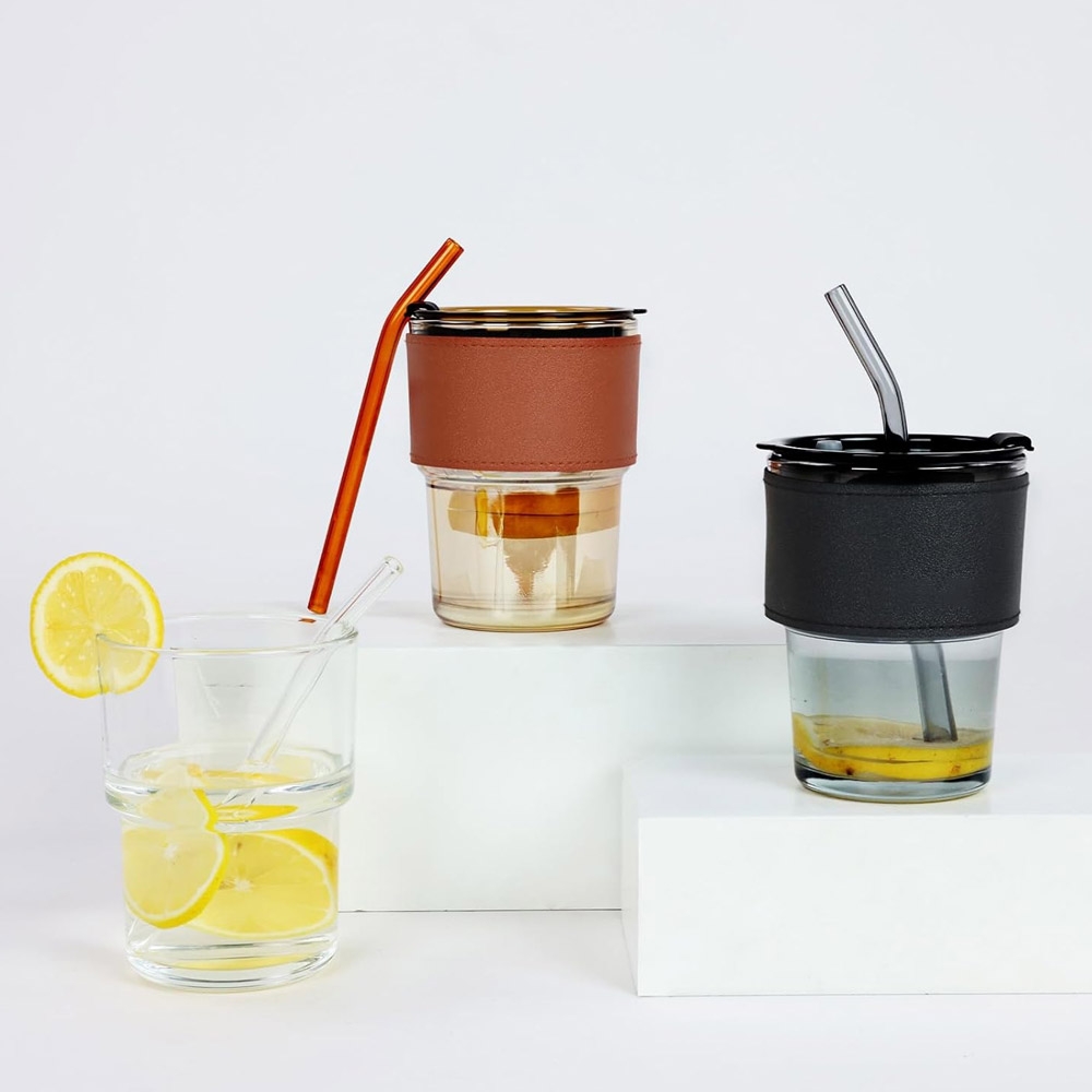Gelas Kaca dengan pegangan kulit, didesain dengan tutup 2 in 1