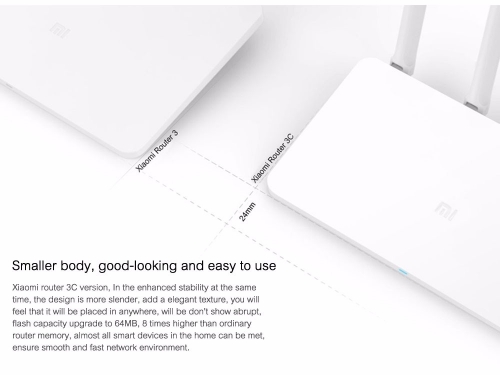 The Xiaomi Mi Wi-Fi Router 3C dilengkapi dengan prosesor MT7628N MediaTek ditambah dengan 64 MB DDR2 RAM dan 16 MB memori internal. Hal ini juga dilengkapi dengan empat antena diperpanjang, 2,4 GHz frekuensi tunggal, yang memastikan bahwa Anda mendapatkan koneksi yang cepat dan stabil dengan sinyal dioptimalkan. Antena memastikan bahwa Anda dapat mengaksesnya bahkan dari jarak jauh; memastikan bahwa sinyal yang tajam di setiap sudut di dalam rumah atau kantor. Hal ini dilengkapi dengan IEEE 802.11 n protokol, dan dengan kecepatan 300 Mbps, itu perbaikan yakin pada router sebelumnya.
